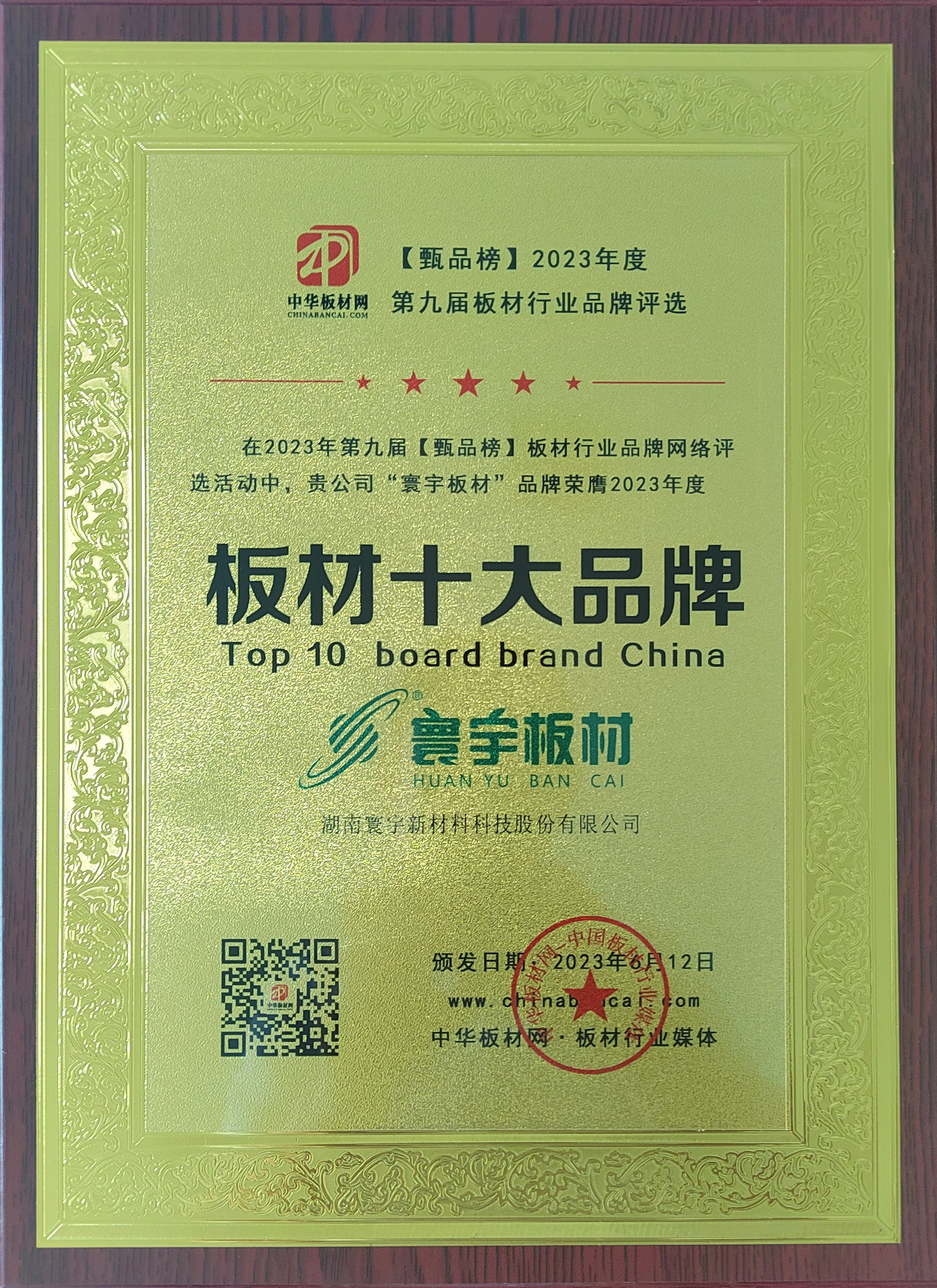 由中华板材网发起的“甄品榜·2023年度中国板材行业十大品牌评选活动”经过30多天的角逐竞争,巅峰之战落下帷幕。寰宇板材凭借着品牌绝佳的口碑、绿色环保的品质等较高的综合评分,荣获2023年度甄品榜·板材十大品牌